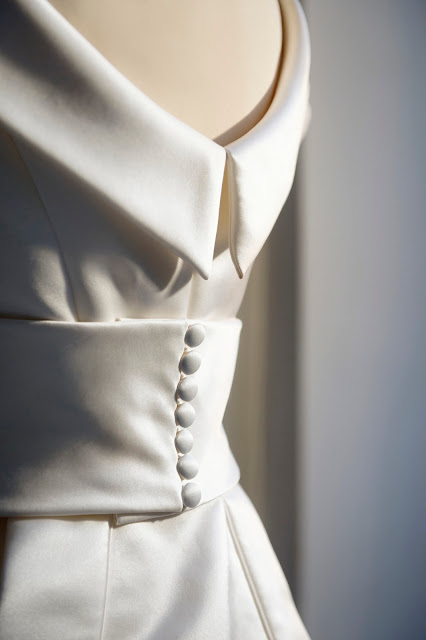 Suknia slubna w perlowym kolorze z dwustronnej satyny miala 4.6 metrowy dopinany tren. Kreacja ma kr�tkie rekawy i kolnierz z zaokraglonym dekoltem. Tyl sukni wycieto na ksztalt litery V, a pasek ozdobiono malymi guzikami, wlasnie do niego przypinany jest tren.